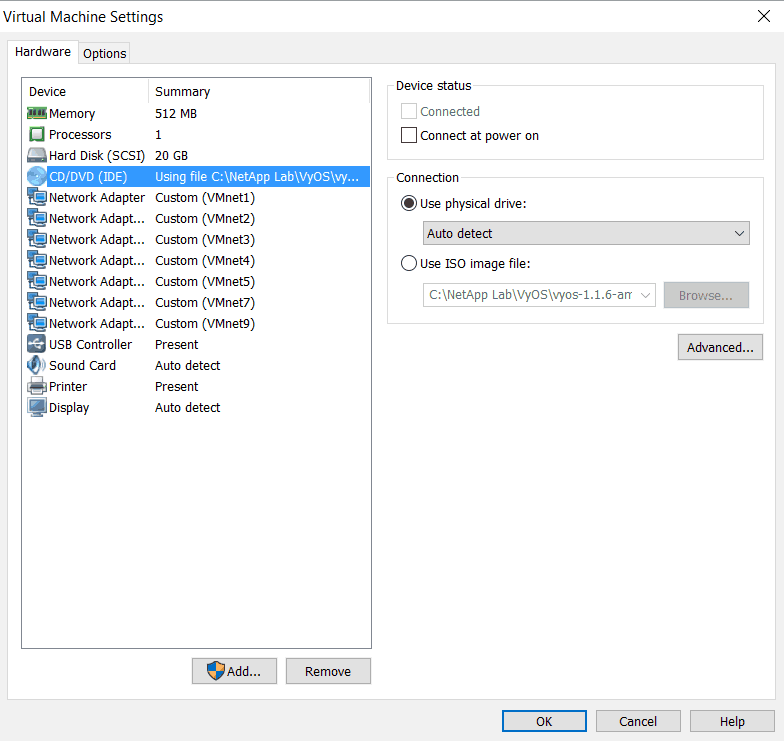 - Select Installer disc image file (iso): and Browse to the VyOS router ISO file in the VyOS folder.