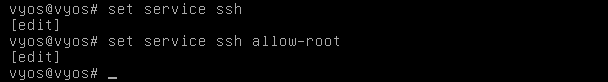 - Enter the commands set service ssh and set service ssh allow-root to enable SSH access.