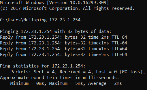 - Enter the command ping 172.23.1.254 to verify connectivity between your laptop and the VyOS router. If the ping fails then you have made a misconfiguration, start the lab setup again from Step 15 in the VMware Workstation Player Install section, being careful to configure everything exactly as shown.