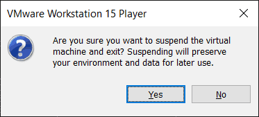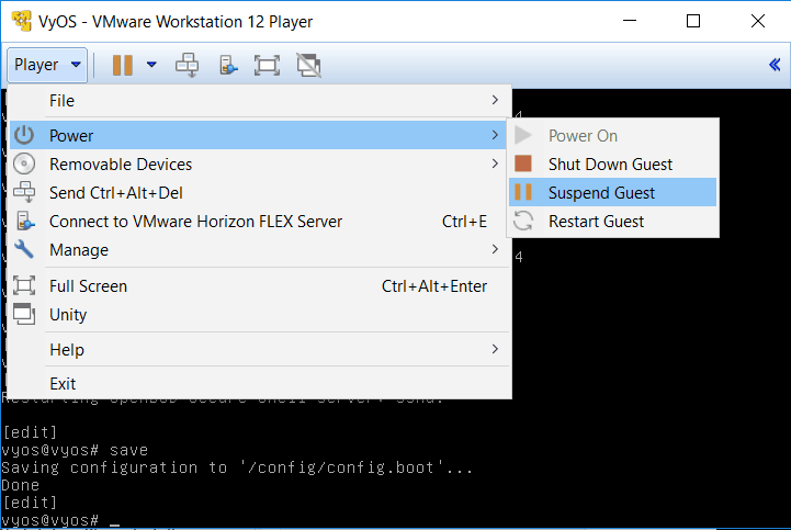 - In VMware Workstation Player, click Player > Power > Suspend Guest to suspend the virtual machine. This will allow you to start it more quickly and reliably when you are ready to work with the lab than if you shut it down.