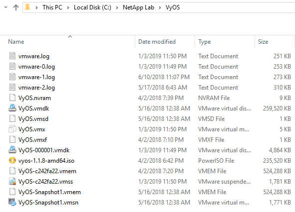 - Installation of the VyOS router is now complete. To start the VyOS virtual machine later, browse to the ‘NetApp Lab\VyOS’ folder and run the ‘VyOS.vmx’ file.